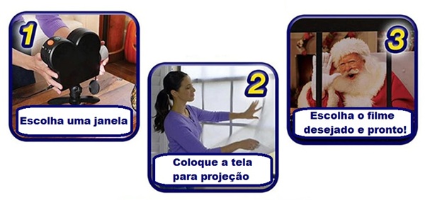 O projetor é completo: vem o projetor com 12 filmes embutidos (6 temas de natal e 6 temas de halloween), tela refletiva para projetor (para instalar na janela) e cabo com fonte para ligar na tomada.