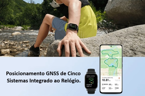 Um dos grandes diferenciais deste modelo é o chip GNSS integrado com cinco sistemas de posicionamento [01:10]. Isso significa que você pode sair para correr ou caminhar e registrar seu trajeto com precisão sem precisar levar o celular junto.